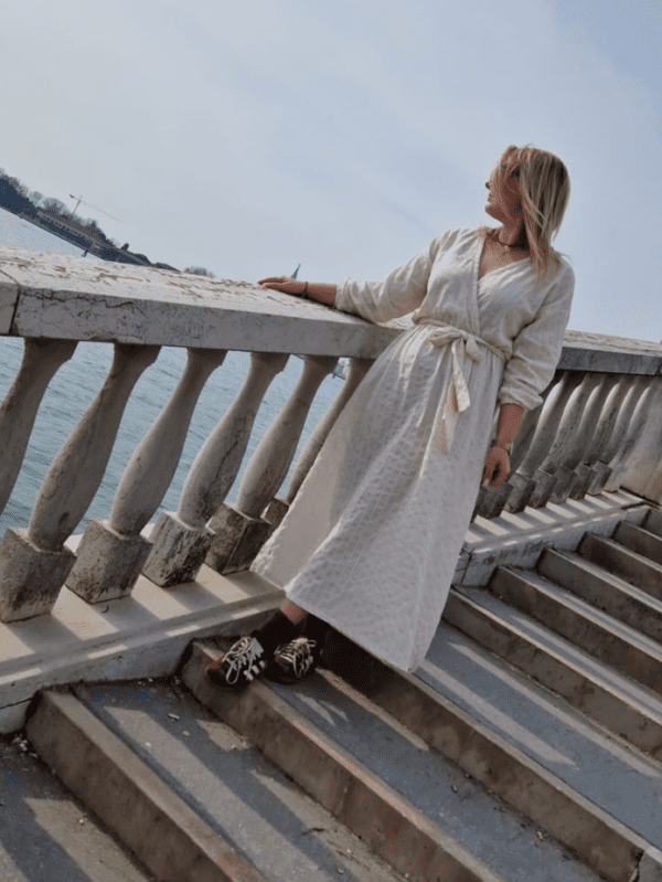 Model z kopertowym dekoltem, odcinany w talii gumką. Dekolt jest dość głęboki – jeśli chcesz, możesz w uwagach do zamówienia poprosić o dodanie zatrzasku w połowie dekoltu lub jego częściowe przyszycie. Dół sukienki jest lekko rozkloszowany. Sama decydujesz o długości rękawa – do wyboru masz aż trzy opcje.
