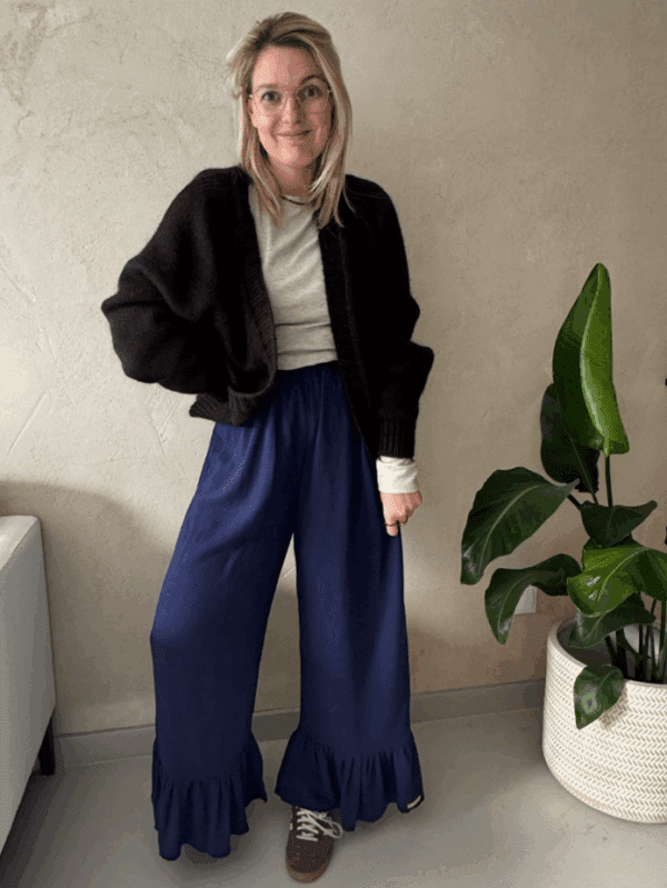 Lekkie, szerokie spodnie uszyte z wiskozy z lnem. Luźny krój zapewnia swobodę ruchów i komfort noszenia, a falbana u dołu nogawki dodaje im dziewczęcego uroku i oryginalnego charakteru. Elastyczna talia sprawia, że spodnie idealnie dopasowują się do sylwetki. Świetne, stylowe, przewiewne i bardzo wygodne.