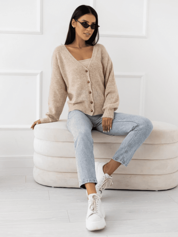 Sweter ma luźny krój, głęboki dekolt w serek i subtelne guziki, co nadaje mu kobiecego, ale i ponadczasowego charakteru. Możesz nosić go solo lub narzucić na ulubiony top – zawsze wygląda stylowo i doskonale dopasowuje się do każdej stylizacji.